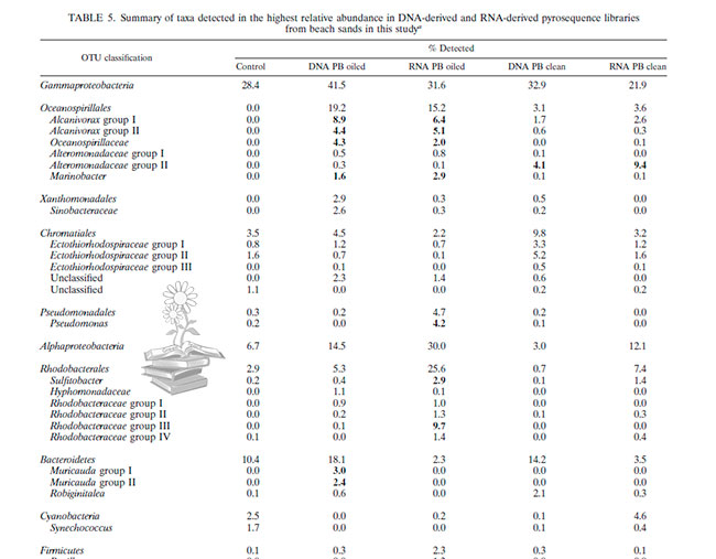 La siguiente tabla muestra un resumen de los taxones detectados en la abundancia relativa más alta en bibliotecas de pirosecuencias derivadas de ADN y ARN de arenas de playa en este estudio. Las abundancias notables de OTU se indican en negrita. Las bibliotecas de control son derivadas de ADN y ARN de la arena de St. George Island muestreadas antes del derrame de petróleo; y PB se refiere a arena de la playa de Pensacola.
